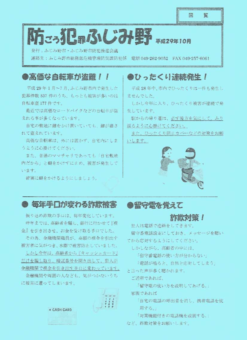 本日、ふじみ野市内で、警察官を騙った振り込め詐欺の電話が多数確認されています。「カードを預かります。」などの不審な電話を受けた場合は、東入間警察署(049-269-0110)までご連絡ください。 |