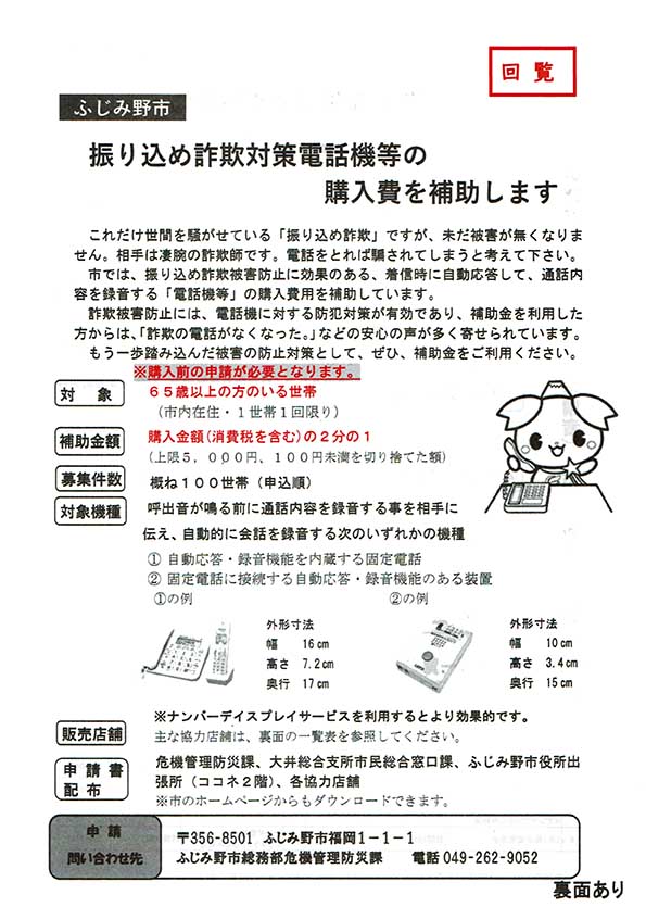 ふじみ野市では、市内の65歳以上の方がいる世帯を対象に振り込め詐欺対策電話機等を購入した場合の費用を補助しています。 |